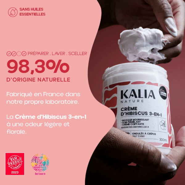 La Crème d’Hibiscus 3-en-1 de Kalia Nature est un soin capillaire polyvalent qui nourrit, démêle et facilite le coiffage des cheveux ondulés à crépus.