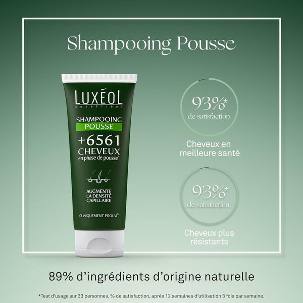 Augmentez la densité de vos cheveux grâce au shampooing pousse Luxéol! Ce Shampooing augmente la densité de votre chevelure et réactive la pousse des cheveux existants avec +6561 cheveux en phase de croissance. Facile à appliquer ce shampoing va nettoyer vos cheveux sans les alourdir. En plus de favoriser la pousse de cheveux, Luxéol Shampooing Pousse procure force et résistance à votre chevelure. Plus forts, et résistants, ils retrouveront visiblement douceur, brillance et volume.